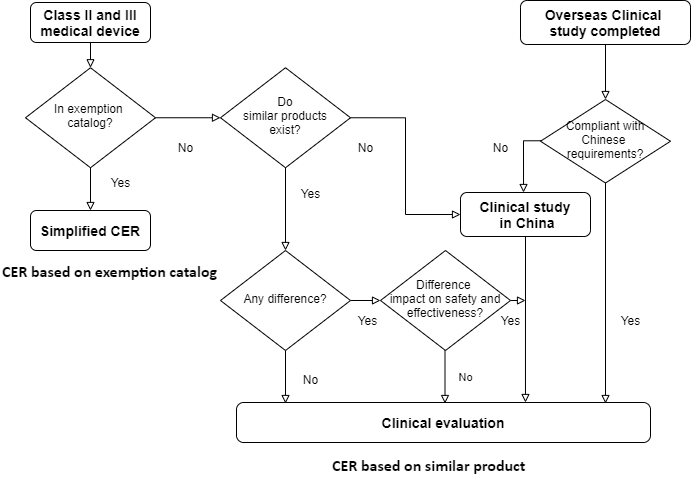 Die Philosophie der klinischen Bewertung in China basiert auf einer weitgehenden Gleichwertigkeit bei der FDA, obwohl in den USA keine klinische Bewertung erforderlich ist. Die Regulierung der chinesischen CER (neu im Jahr 2021) entspricht bis auf die Post-Market-Details fast der europäischen Regulierung. Das betreffende Gerät wird mit gleichwertigen oder ähnlichen Geräten verglichen, die normalerweise dieselbe Produktgruppe (chinesischer Produktcode), einen ähnlichen Verwendungszweck und ähnliche technische Eigenschaften aufweisen.