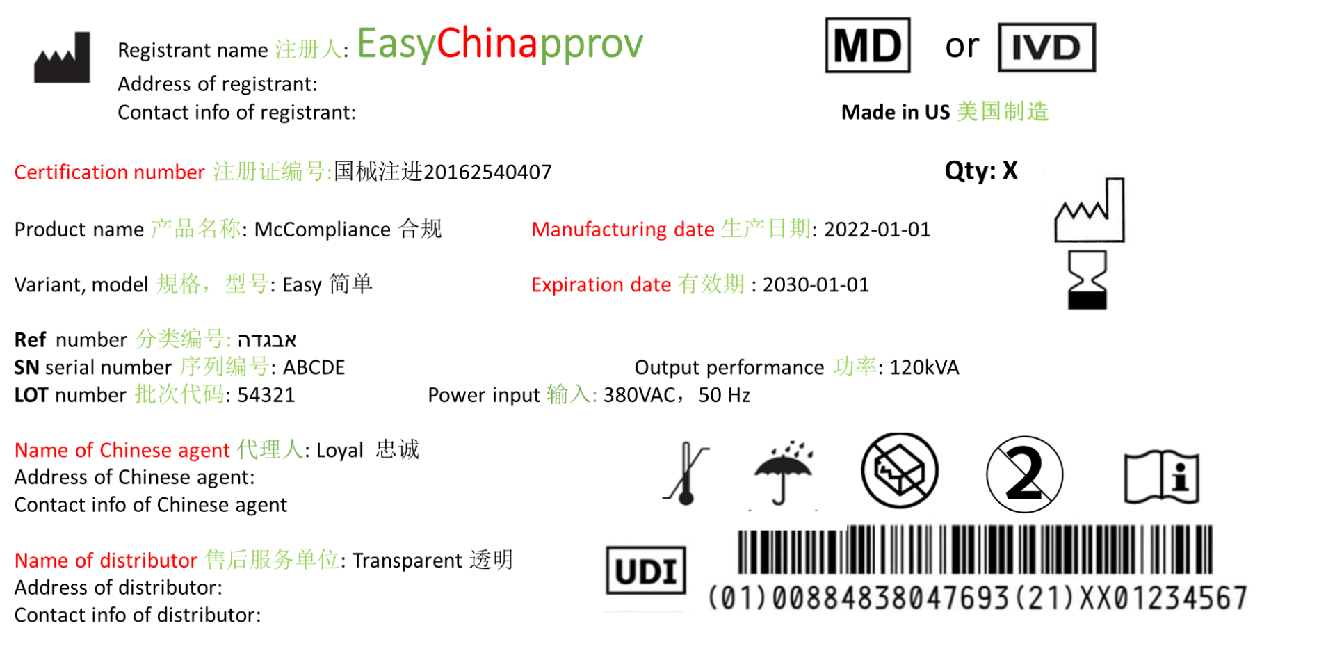 · Zertifizierungsnummer und Herstellungsdatum (siehe Beispiel oben), die im Beispiel eines chinesischen Etiketts rot markiert sind, dürfen erst nach der Produktgenehmigung hinzugefügt werden. Die Zertifizierungsnummer sollte auf dem Etikett und auf dem chinesischen Zertifikat für Medizinprodukte und IVD konsistent sein. Das Herstellungsdatum sollte nicht vor dem Ausstellungsdatum des chinesischen Zertifikats liegen